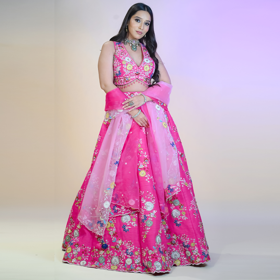 Pink Designer lehenga choli with dupatta, beads and stones, Floral stitched blouse, has a v-neck, sleeves less,